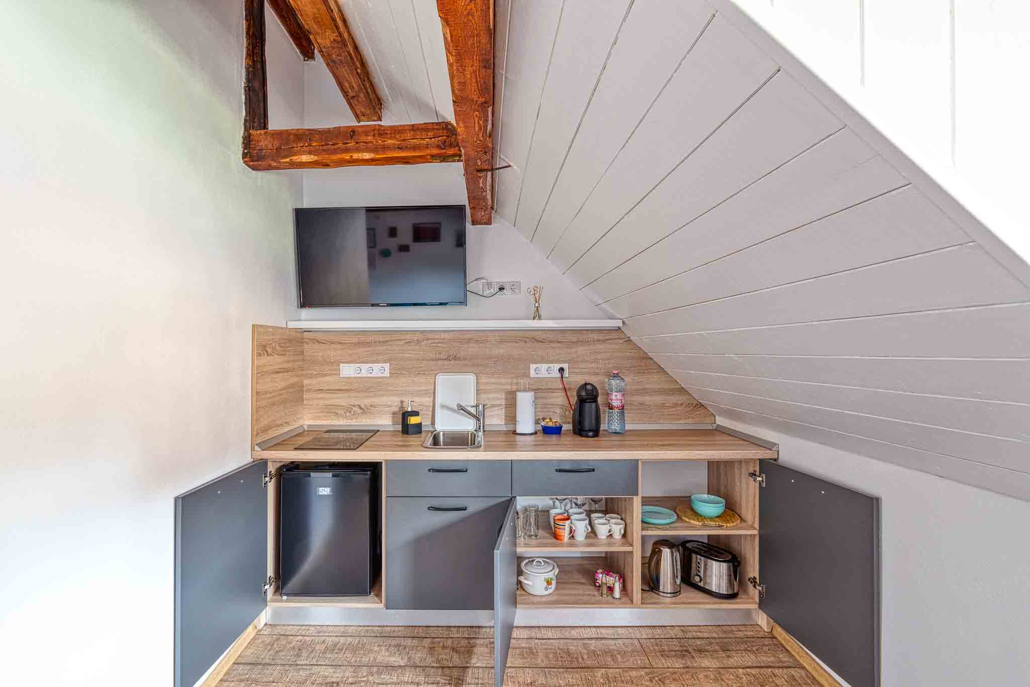 with a fridge, electric hob, toaster, kettle, krups nescafe espresso machine and AC. Towels and toiletries are provided.